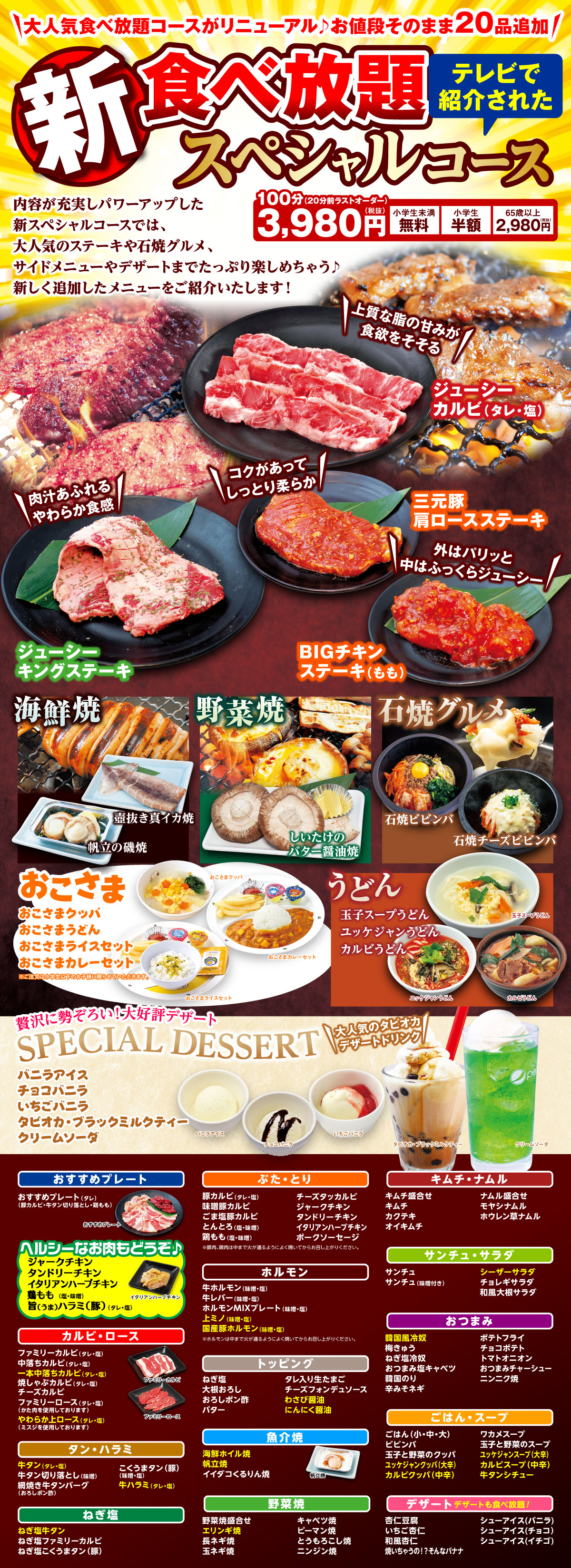 トップ フェア情報 Fair フェア情報 【お知らせ】食べ放題スペシャルコースがリニューアル!TVでも紹介されました! ※足立加平店、稲毛駅前店、歌舞伎町店、五反田駅前店、新小岩店、西早稲田店、下北あんらく亭では、内容・価格が異なります。 フェア一覧に戻る