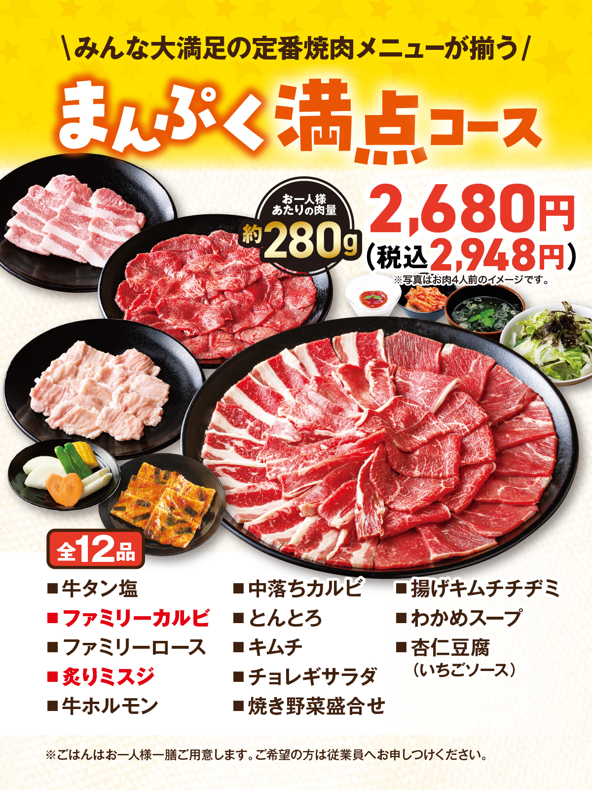 キムチ、もやしナムル、ほうれん草ナムル、チャンジャ、韓国のり、サンチュ、枝豆、味噌きゅうり、ちょこっとオニオンサラダ、ポテトフライ、コーンバター、自家製!鶏のから揚げ、メープルチーズ唐揚げ、ソーセージ、キムチチヂミ、塩こんぶキャベツ