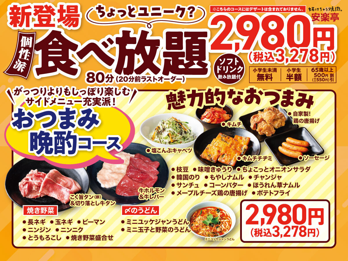 お酒に合うペア焼肉2種と豊富なおつまみ、飲みの〆には食べ放題に新登場のミニうどんをどうぞ♪飲みたいあなたにぴったりなコースをご用意いたしました★