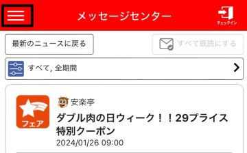 (1)アプリの最初の画面上部に表示されている三本線のマークをタップして、メニュー画面を開きます。