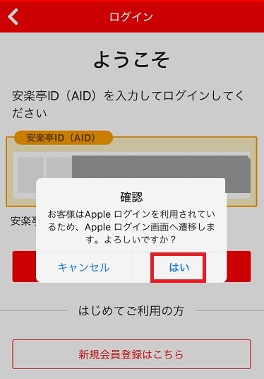 (4)お客様が連携している外部アカウント(Apple、Google、Facebook、Twitter、Mail)に応じて、以下のメッセージが表示されますので、メッセージ内の「はい」を押して外部アカウントのログインを行ってください。