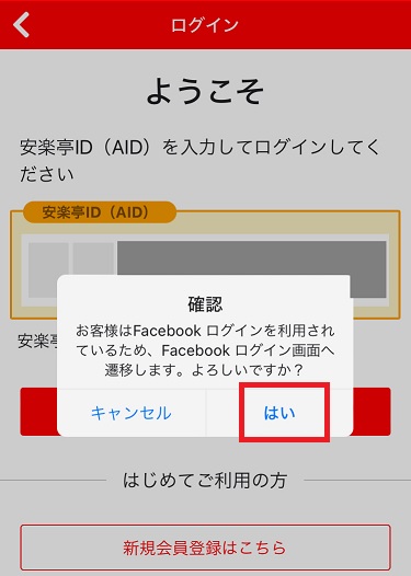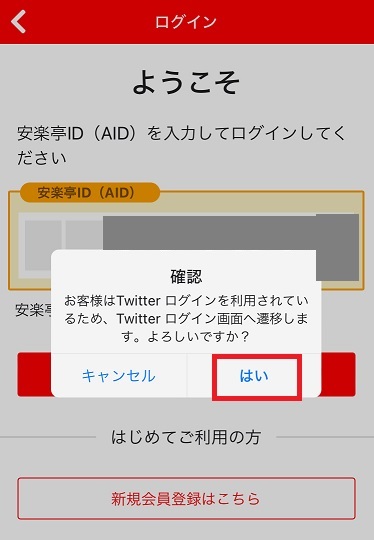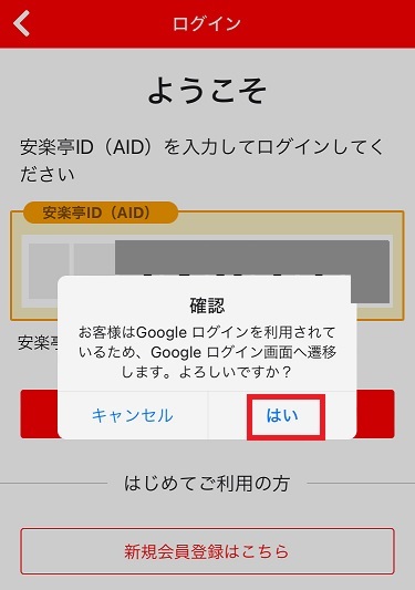 (5)外部アカウントのログインが完了すると、安楽亭アプリへログインが行えます。