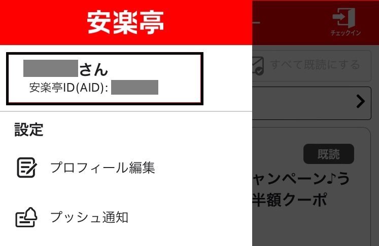 ログインが完了すると、メニュー画面にお客様のお名前と安楽亭ID(AID)が表示されます。