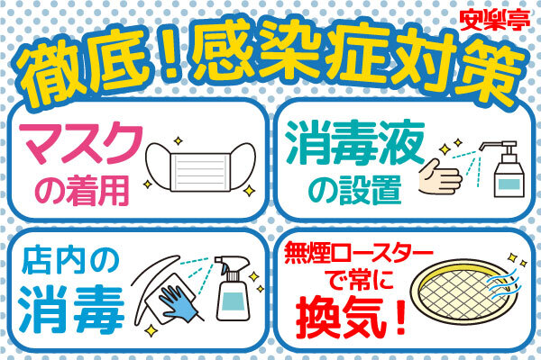 安楽亭グループ各店舗では、お客様ならびに従業員の安全のため、以下感染症対策を実施しております。