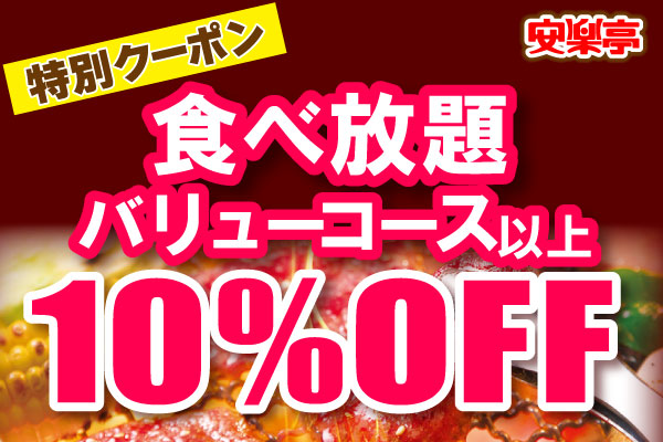 安楽亭では、3/22(火)から3/31(木)までの期間限定で、「食べ放題(バリューコース以上)10%OFF」クーポンを配信!