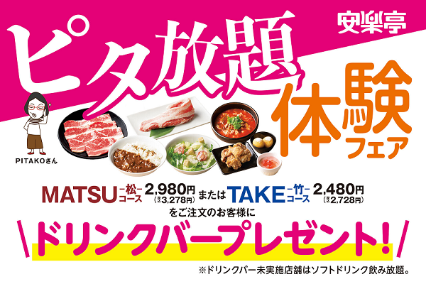 【期間限定★6/9(木)まで】『ピタ放題』「TAKE(竹)」「MATSU(松)」コースはドリンクバーが無料に♪